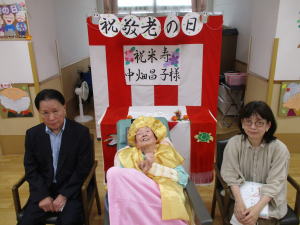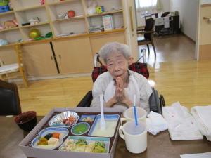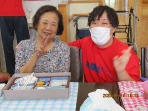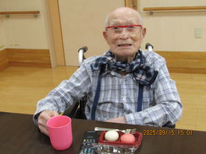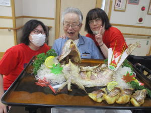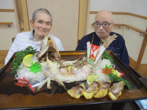 | 敬老の日です。皆さんご長寿誠におめでとうございます。立派なタイにお祝い膳と、皆さんに喜んで貰えたのでは無いでしょうか?気候が変わり、暑い日が続いていますが、引き続き皆で頑張りましょう(^^♪ | |