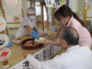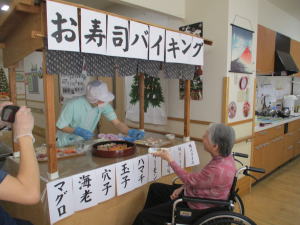 | 恒例の大人気行事、お寿司バイキング♪今回はメニューを一部変えてみました('◇')ゞ今まで意外にも無かったネギトロ入りました(*'▽')食べやすい為皆に好評です。後は、お肉のお寿司として、カモ肉の寿司も入れました。見慣れないお寿司に皆さん驚いていましたが、あっさりした味わいでこちらも好評でしたよ('◇')ゞ | |